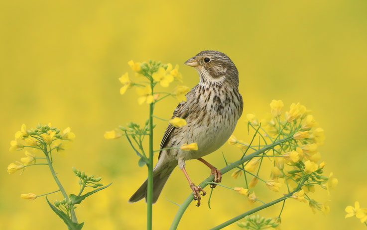 Im Winter ist sie auch anzutreffen. Sie bevorzugt dann Flächen, auf denen Sie noch etwas Getreidekörner finden kann. Hier können die Ansammlung bei günstigen Verhältnissen bis über 200 Individuen erreichen. An solchen Plätzen findet sich oft auch die Gesellschaft mit Goldammern und Feldsperlingen.