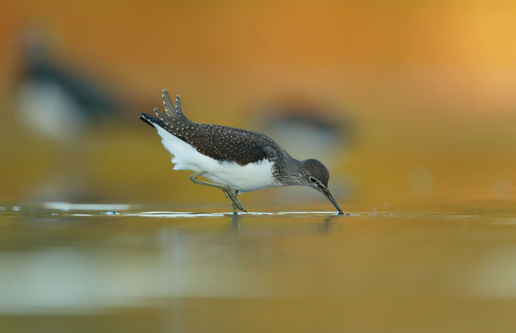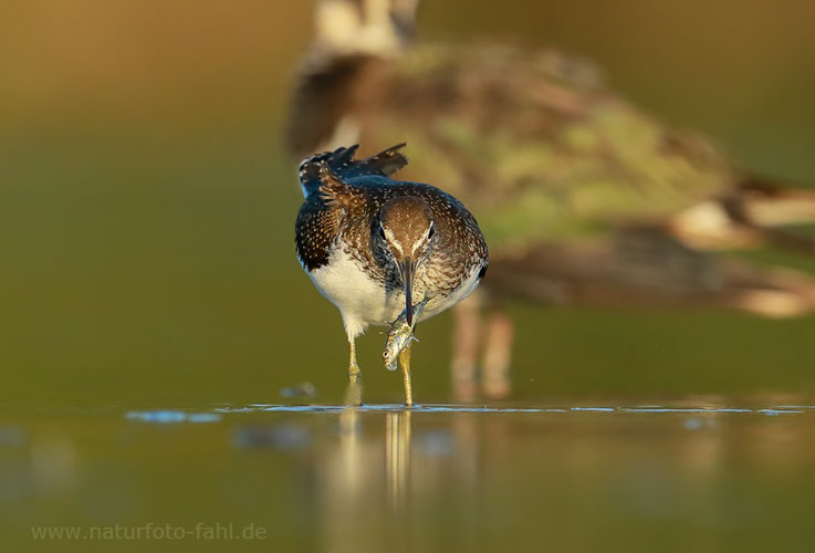 Der Waldwasserläufer kann - wie viele andere Wasserläufer - auch Kleinfische erbeuten. Den Dreistachligen Stichling aber verschmäht er letztlich doch. Zu sperrig....